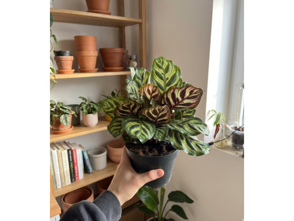 Calathea ‘Makoyana’ miluje vyšší vzdušnou vlhkost, pravidelnou zálivku a rozptýlené světlo. Nepotřebuje přímé slunce, naopak ocení mírný polostín. Pokud jí dopřeješ stabilní podmínky a měkkou, odstátou vodu, odvděčí se krásnými novými listy doslova každý měsíc.
