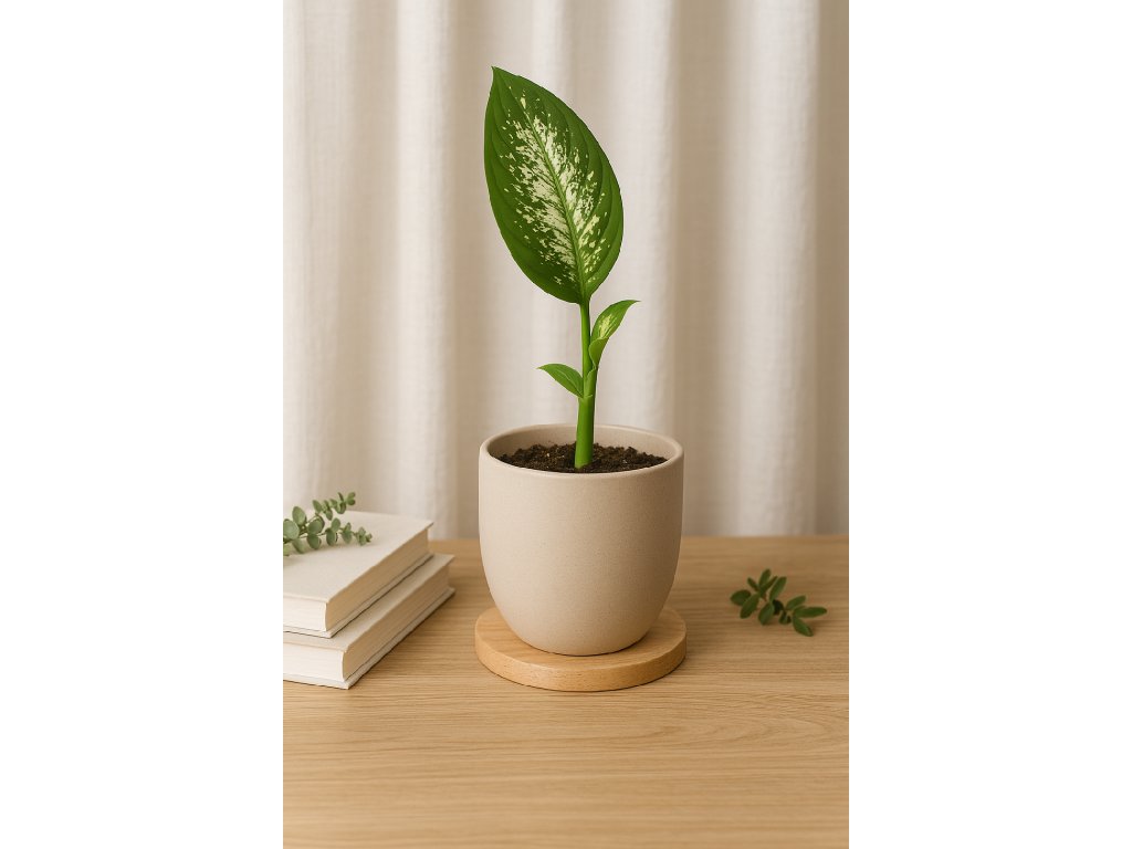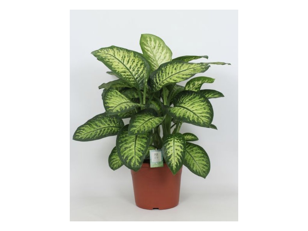 Po zakořenění začne dieffenbachia postupně tvořit nové listy s typickou pestrou kresbou. Roste vzpřímeně a v běžné domácnosti poměrně svižně. Jakmile se dobře uchytí, jde o stabilní pokojovou rostlinu vhodnou do bytu i kanceláře.
