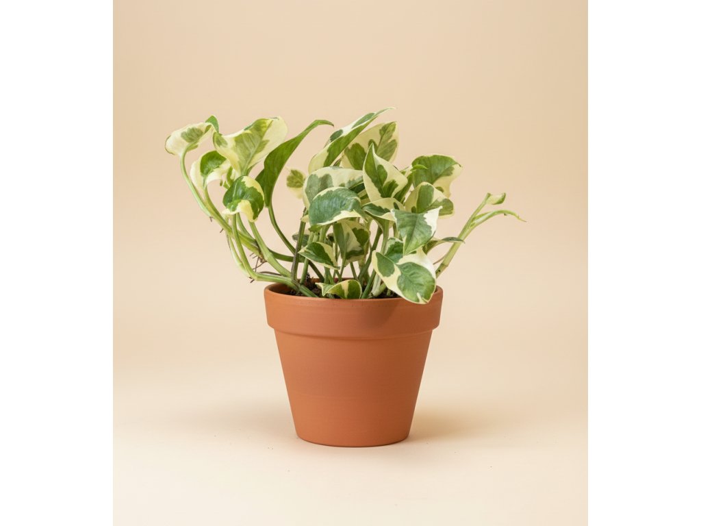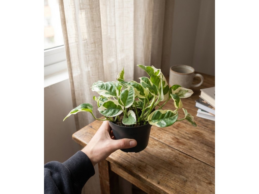 Epipremnum pinnatum ‘N’joy’ je oblíbená variegovaná forma s drobnými, pevnými lístky, které zdobí kombinace čistě bílé a sytě zelené barvy. Každý list je originál — někdy více bílý, jindy s jemnými zelenými pruhy. Vypadá perfektně v závěsných květináčích, na policích nebo vedené po opěře.