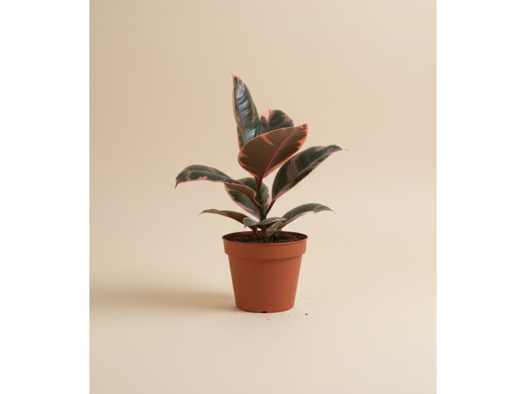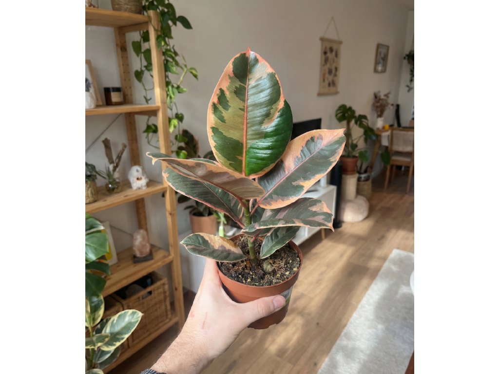 Ficus elastica ‘Belize’ patří mezi barevně nejvýraznější gumovníky. Jeho listy mají nepravidelnou panašaci v odstínech zelené, světlé krémové a často i růžové, která se nejvíce projevuje na mladých listech. Každá rostlina tak působí originálně a živě.