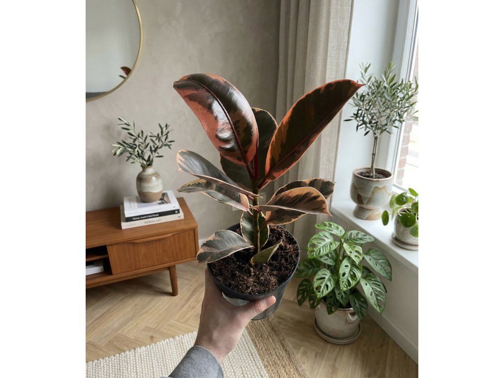 Ficus elastica ‘Belize’ patří mezi atraktivní kultivary gumovníků, které zaujmou svými panašovanými listy. Kombinace zelené, krémové a jemně růžových odstínů vytváří výrazný, ale stále elegantní vzhled.
