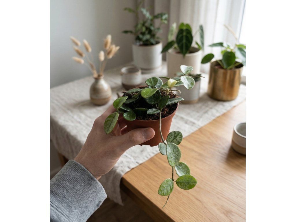 Hoya ‘Mathilde’ je oblíbený hybrid, který zaujme svými malými, kulatými listy s jemným stříbřitým vzorem. Díky svému kompaktnímu růstu působí velmi upraveně a dekorativně.