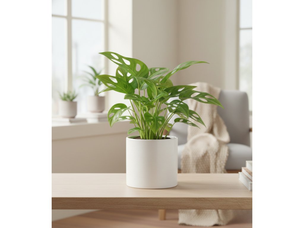 Díky větší velikosti se hodí jako solitér na komodu, stůl nebo parapet, kde krásně zvýrazní listovou kresbu i celkový tvar rostliny. Bílá keramika je univerzální — skvěle ladí s jakoukoli barvou listů i stylem interiéru.