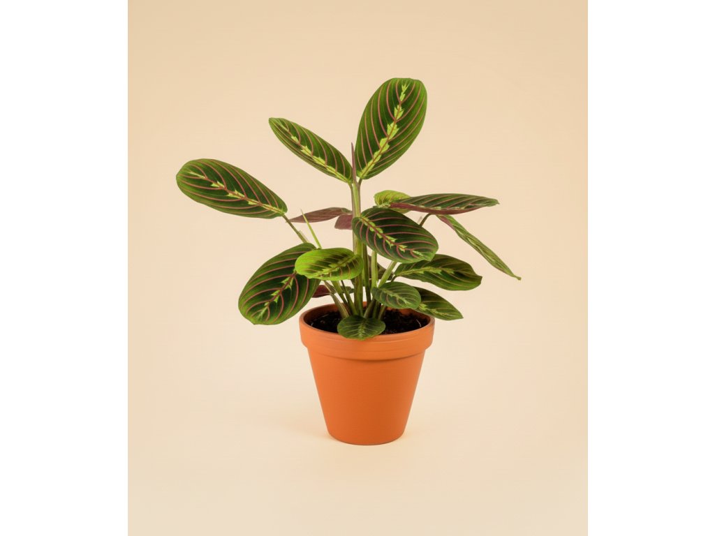 Maranta leuconeura ‘Fascinator’ je ikonická „modlitební rostlina“, známá svými oválnými listy s tmavě zeleným okrajem, světlejším středem a výrazným růžovým žilkováním. Spodní strana listů má sytě vínovou barvu, takže rostlina vypadá efektně ze všech stran. Večer se její listy zvedají nahoru — typický pohyb, díky kterému maranty působí živě a fascinují při každém pozorování.