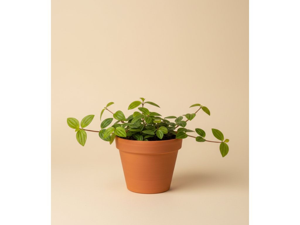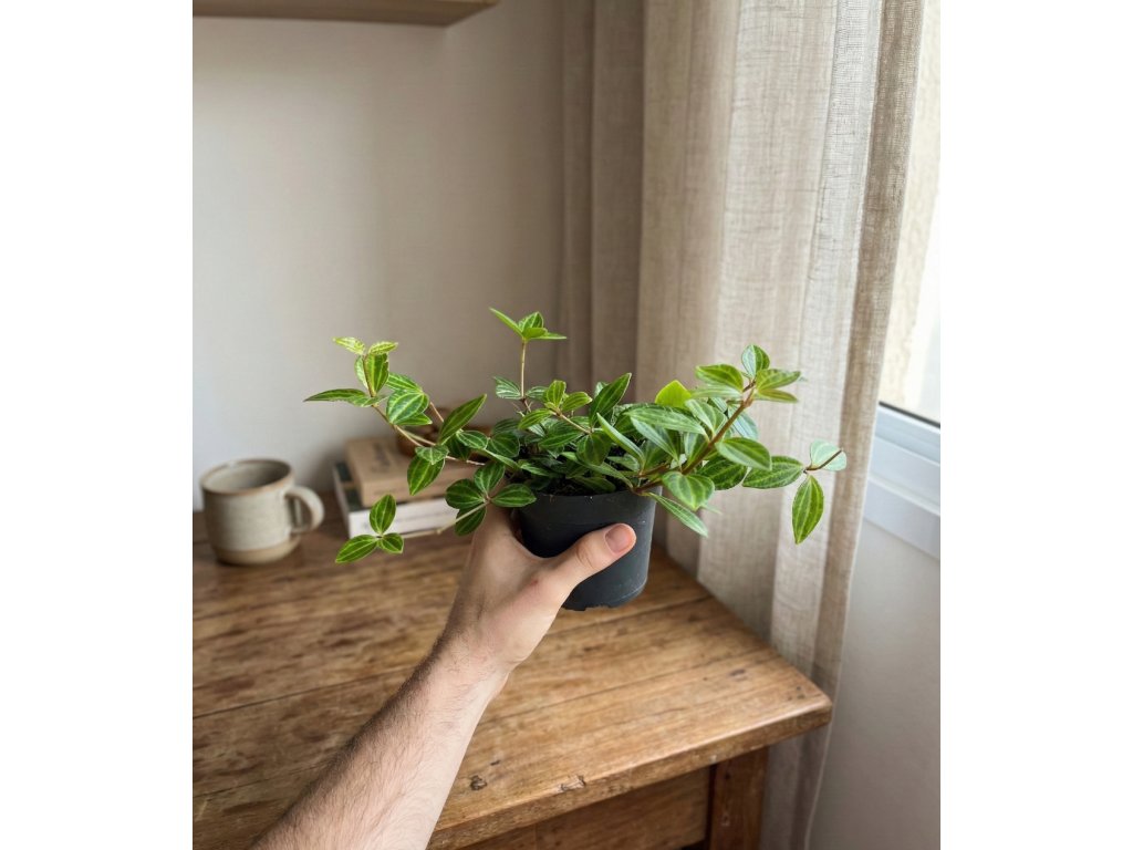 Peperomia ‘angulata’ je oblíbená pro svůj jemný, ale přitom výrazný vzhled. Má tenké převislé výhony a drobné, lehce masité listy, které jí dodávají lehkost a nenucený charakter. Nepůsobí dominantně, spíš přirozeně doplňuje prostor.