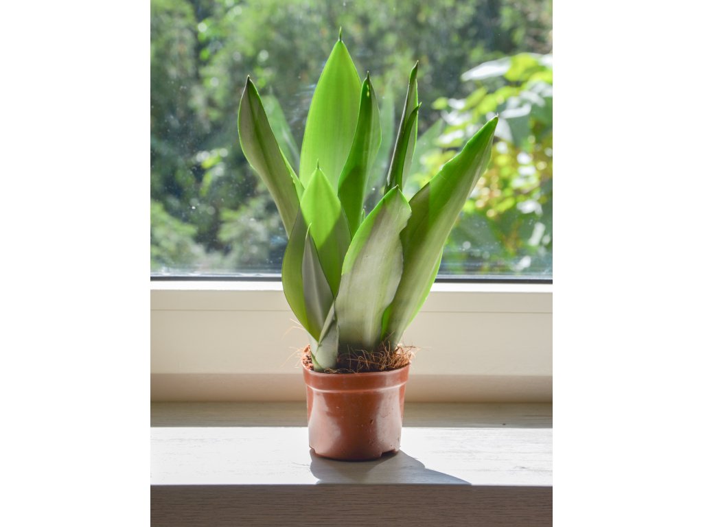 Sansevieria 'Moonshine' vyniká svým futuristickým vzhledem – její listy jsou světlé, téměř stříbrné, matné a rostou vzpřímeně v symetrických řadách. Působí čistě a minimalisticky, ideálně zapadne do moderního interiéru nebo kanceláře.