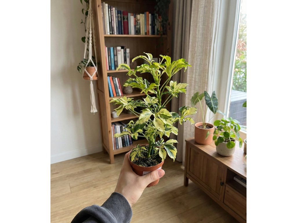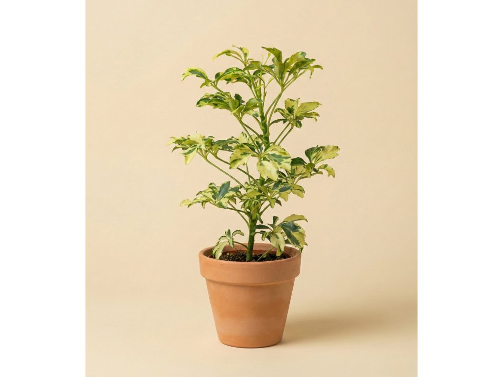 Schefflera arboricola ‘Janine’ je elegantní pokojová rostlina s drobnými, lesklými listy, které mají jemné krémově zelené panašování. Díky této kresbě působí světle a vzdušně, aniž by byla výrazná nebo rušivá.