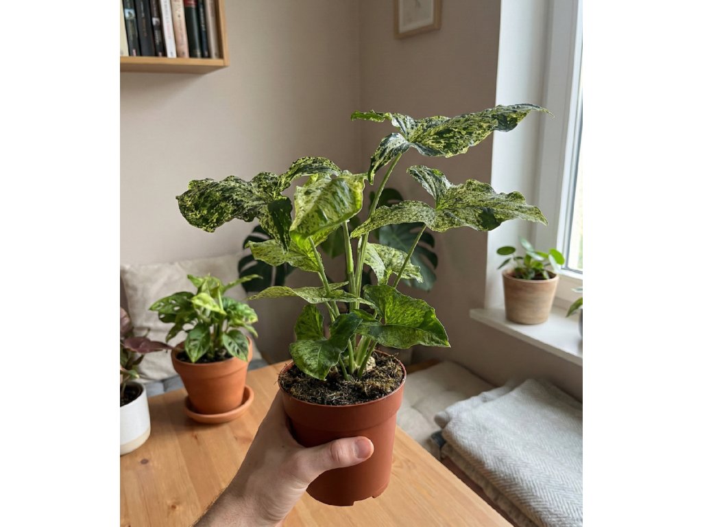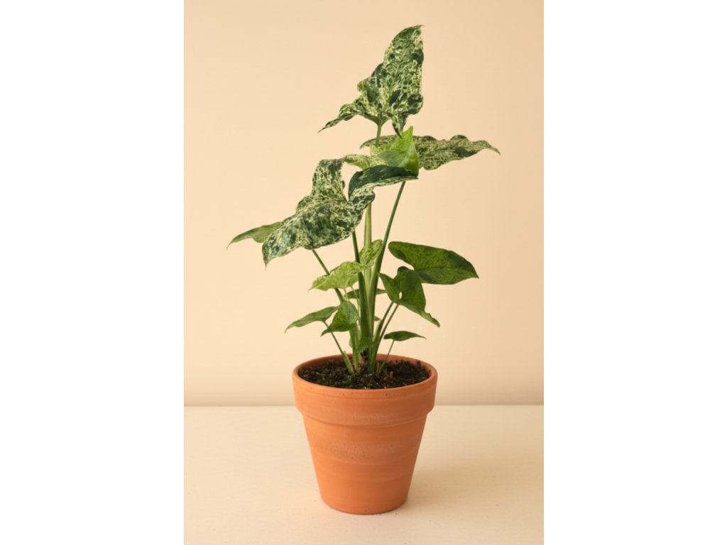 Syngonium ‘Mottled’ zaujme nepravidelnou kresbou listů, která dává každé rostlině originální vzhled. Na první pohled působí nenápadně, ale při bližším pohledu je patrná jemná struktura a barevné přechody, které se mění s věkem listů.