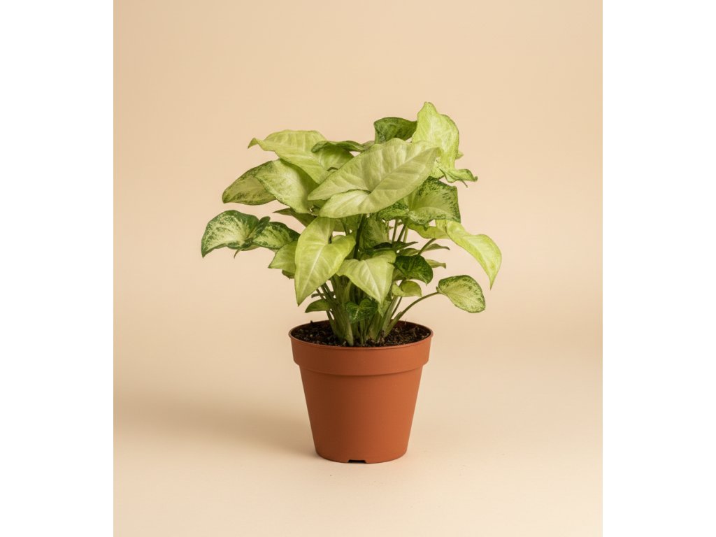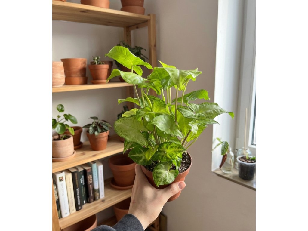 Syngonium patří mezi nejméně náročné pokojovky. Nejlépe mu vyhovuje rozptýlené světlo, ale zvládne i polostín. Substrát udržuj lehce vlhký — nesnáší přemokření, ale zároveň nechce úplné sucho. Miluje také vyšší vzdušnou vlhkost, díky které rychle tvoří nové listy a barvy jsou výraznější.