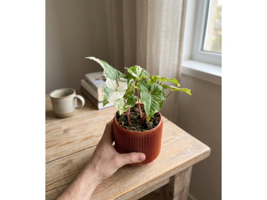 Syngonium Albo ‘Variegata’ patří mezi oblíbené panašované syngonie, které zaujmou nepravidelným zbarvením listů – každý je trochu jiný. Právě tahle proměnlivost dělá z rostliny zajímavý a živý prvek v interiéru.