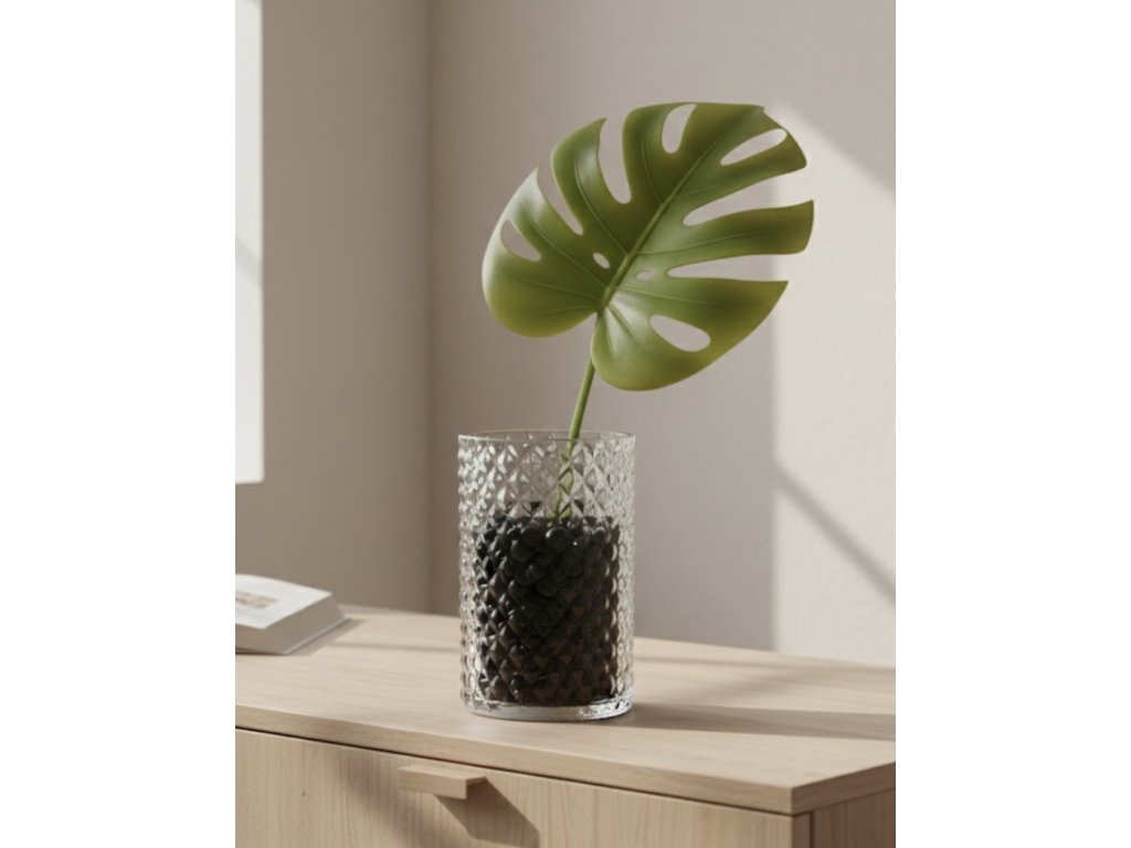 Stylová čirá váza z lisovaného skla s výrazným diamantovým vzorem. Díky reliéfnímu povrchu působí elegantně, odráží světlo a dodá květinám i interiéru zajímavý dekorativní efekt.
